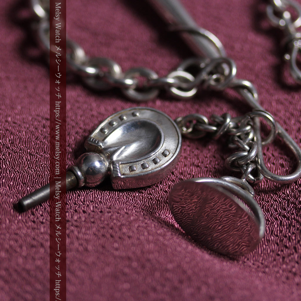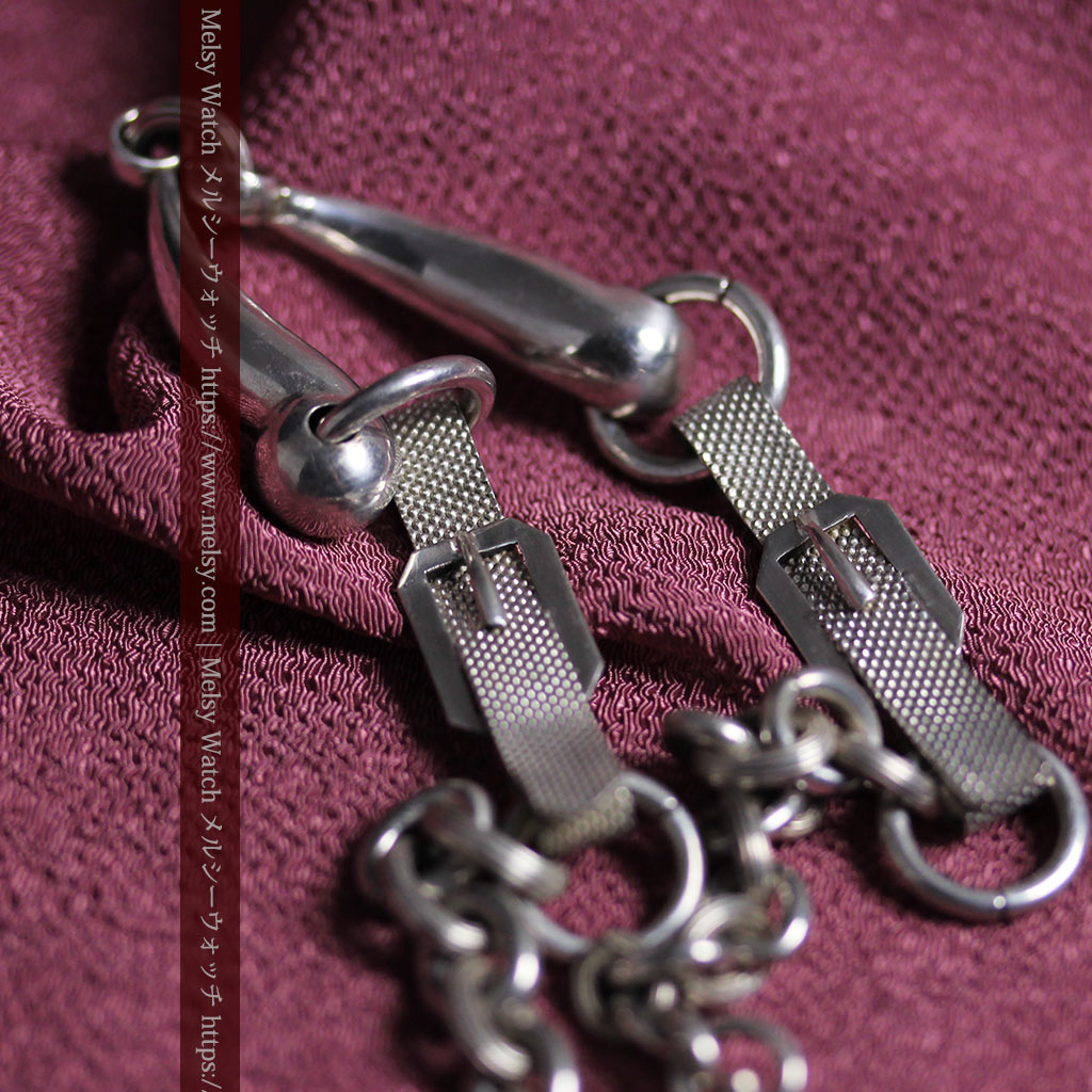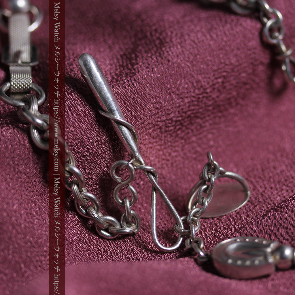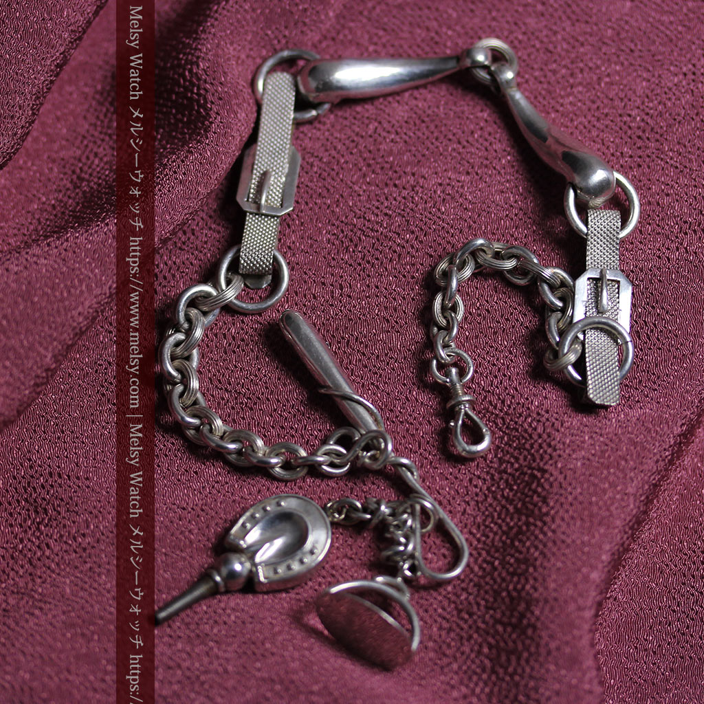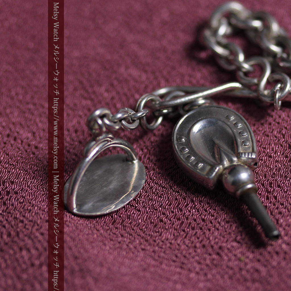 先端に吊り下げられている飾りは、馬の蹄鉄型の鍵巻き(鍵巻き式の懐中時計を操作するもの)で、そしてもう1つは写真ではお分かり頂きにくいかもしれませんが、足を置く鐙の形になっています。