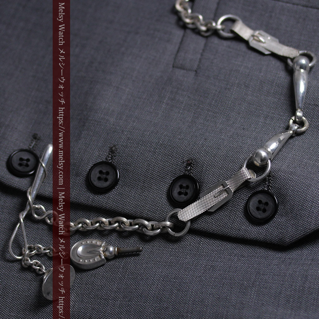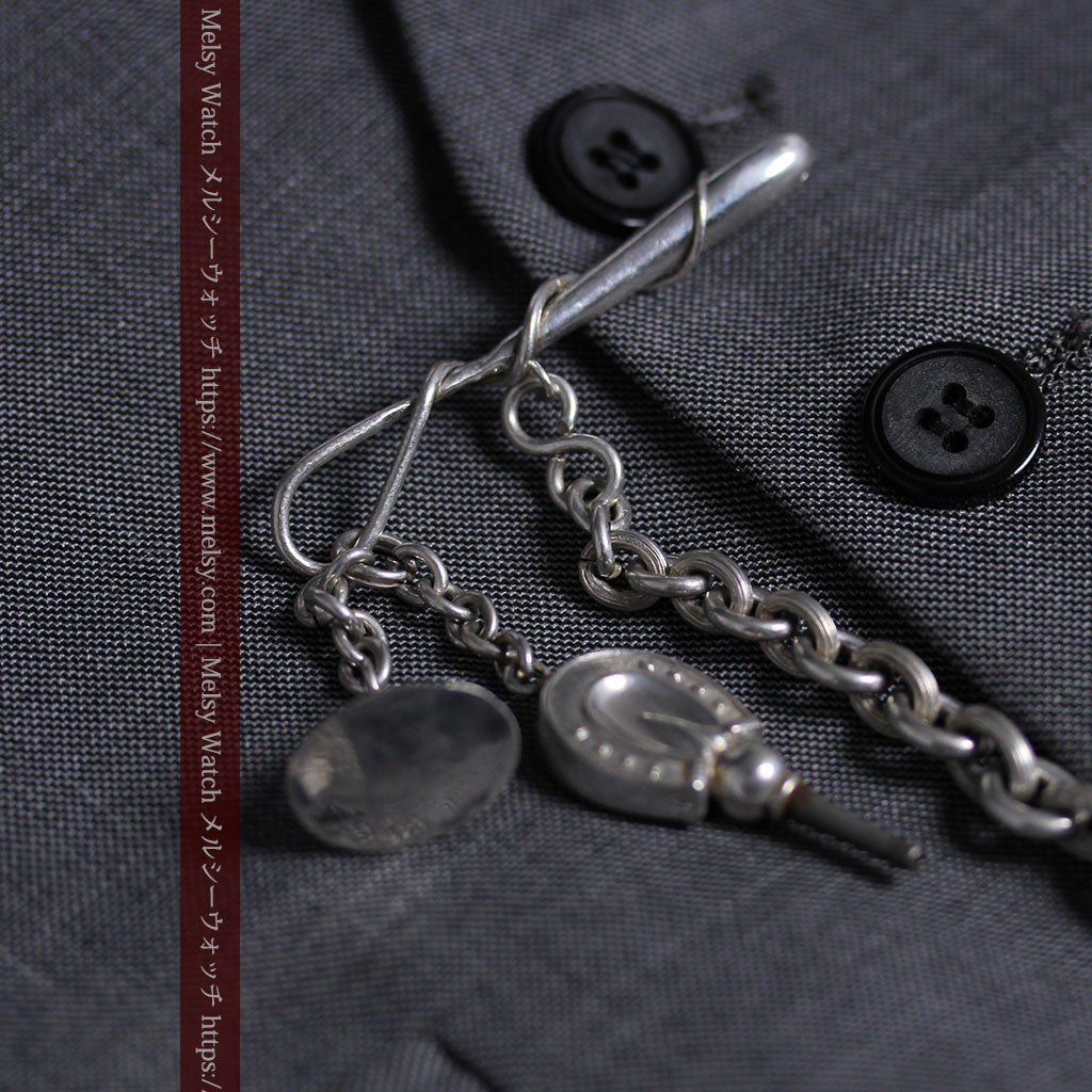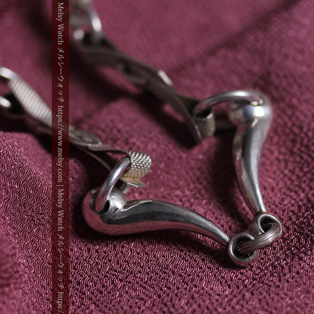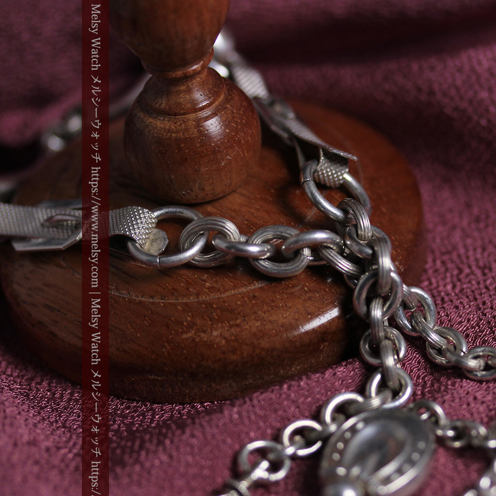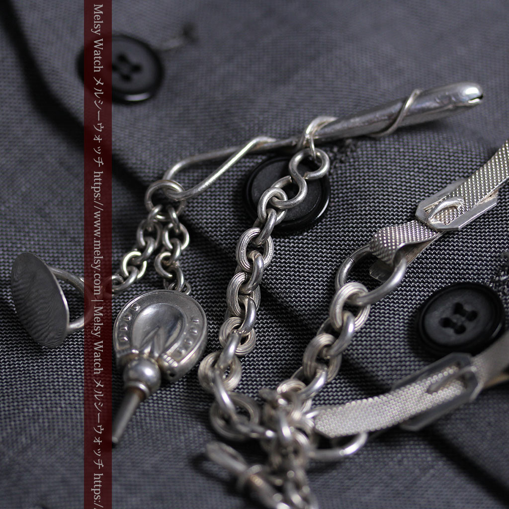 先端に吊り下げられている飾りは、馬の蹄鉄型の鍵巻き(鍵巻き式の懐中時計を操作するもの)で、そしてもう1つは写真ではお分かり頂きにくいかもしれませんが、足を置く鐙の形になっています。