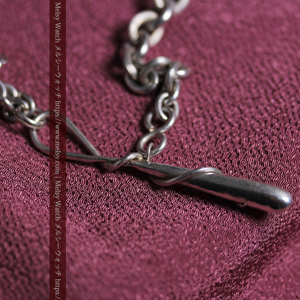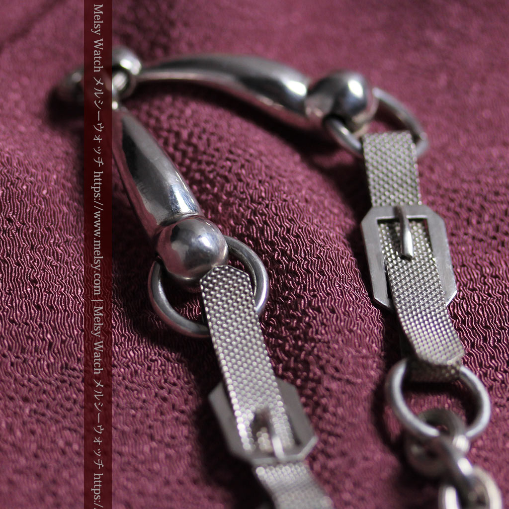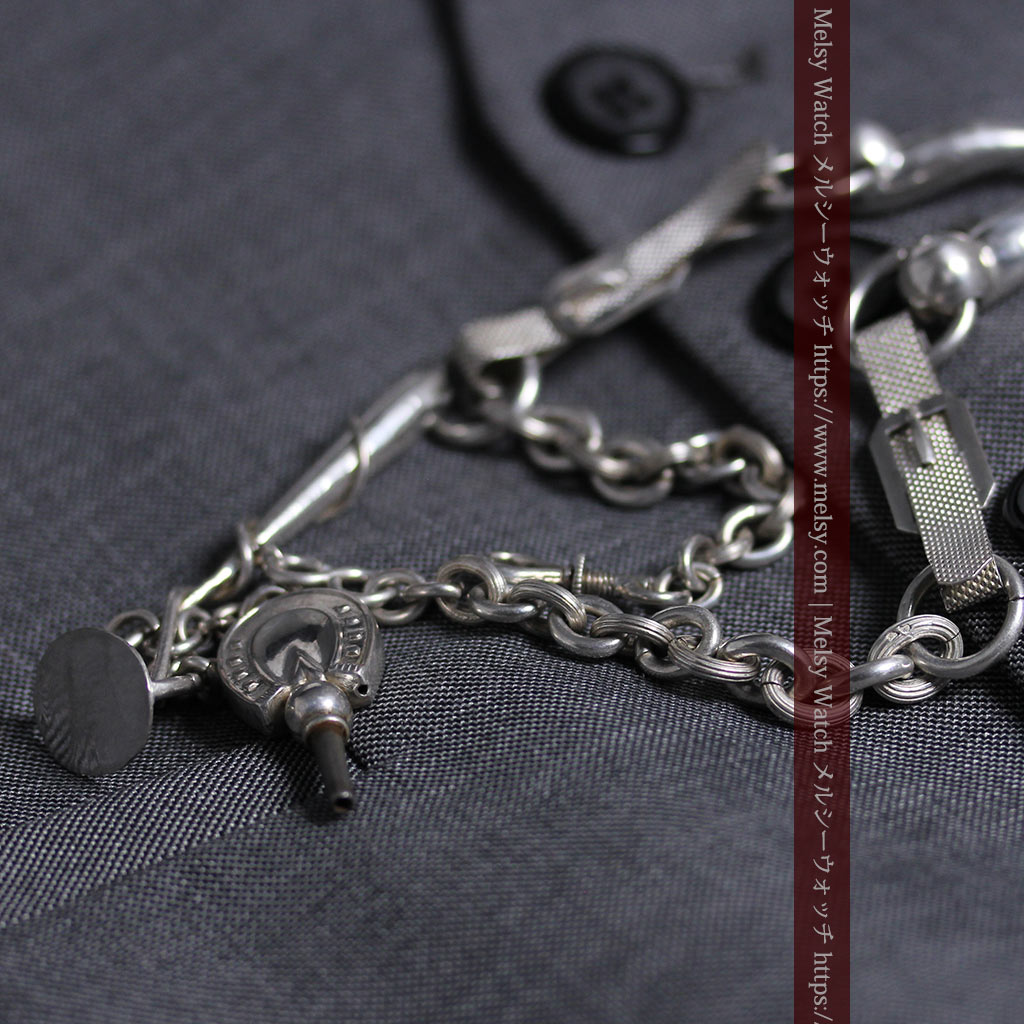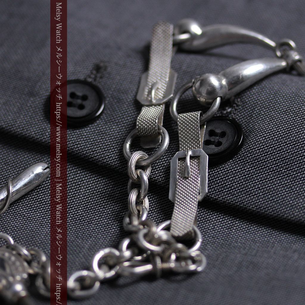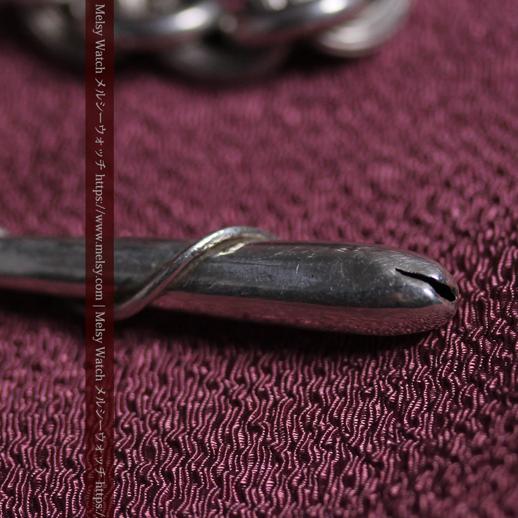 先端に吊り下げられている飾りは、馬の蹄鉄型の鍵巻き(鍵巻き式の懐中時計を操作するもの)で、そしてもう1つは写真ではお分かり頂きにくいかもしれませんが、足を置く鐙の形になっています。