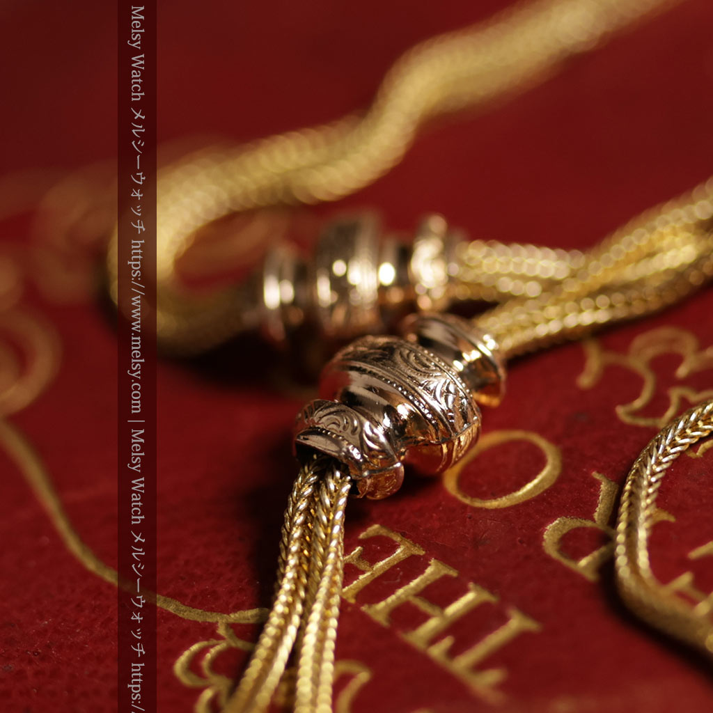 紐の部分の金色に、飾りや両端はアンティークならではの赤味の差した金色。