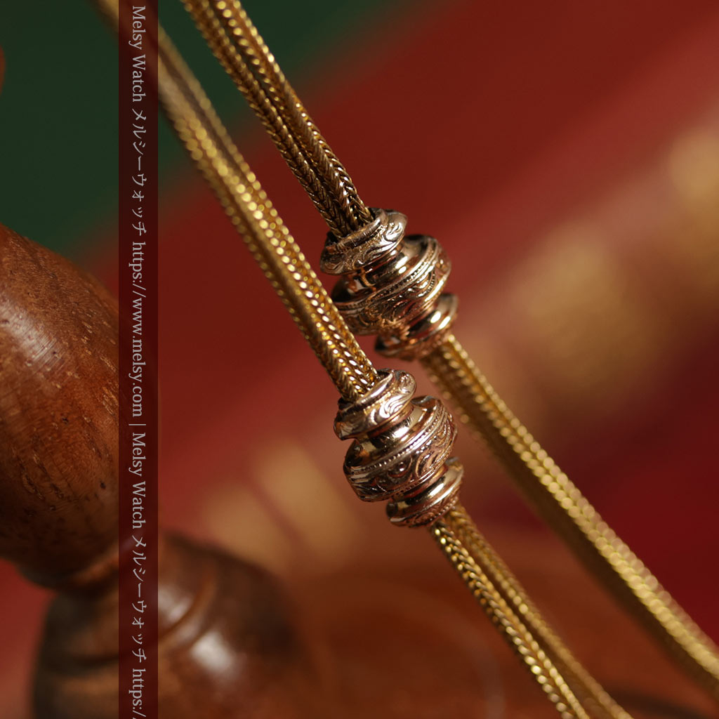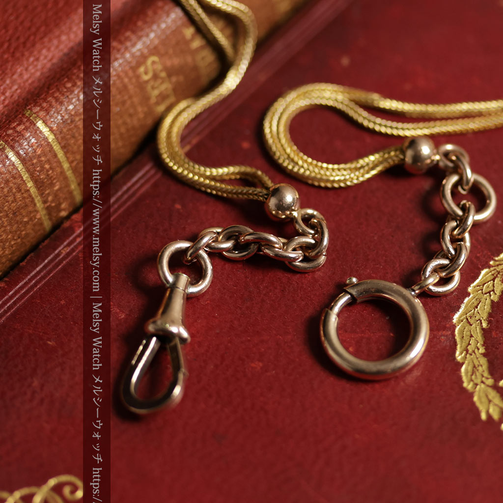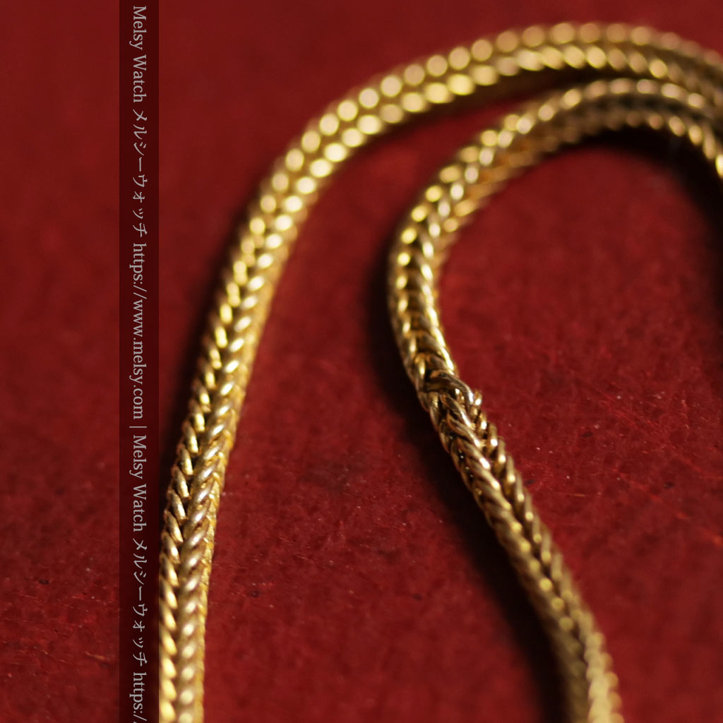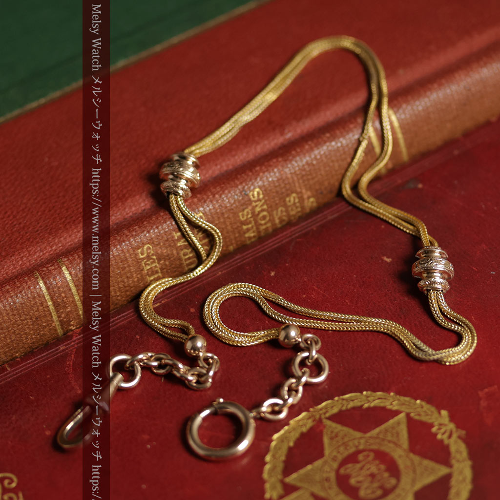 作り自体がアンティークですので、新しい年代のもので見かけることは非常に少ないのですが、定番の厚みや重厚さのあるチェーンとは違って、金属の紐状になっていますので、紐のように軽い感じで形状も紐のように柔らかく変えてくれる。