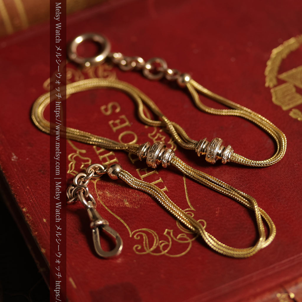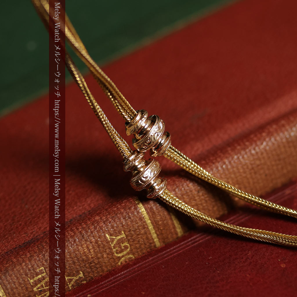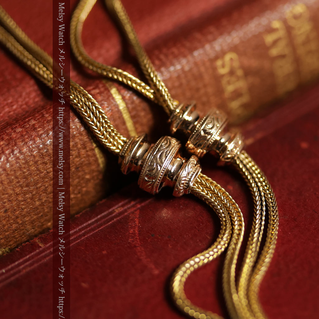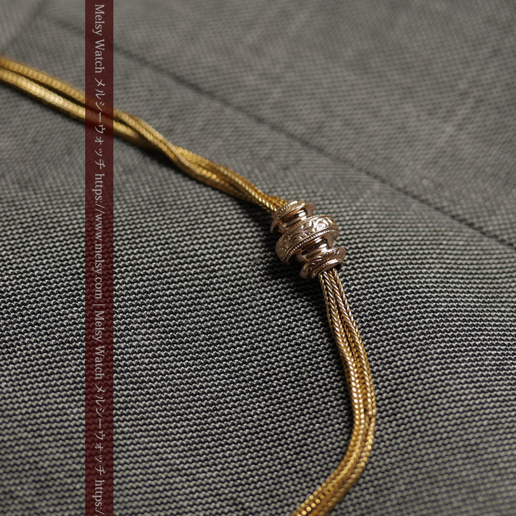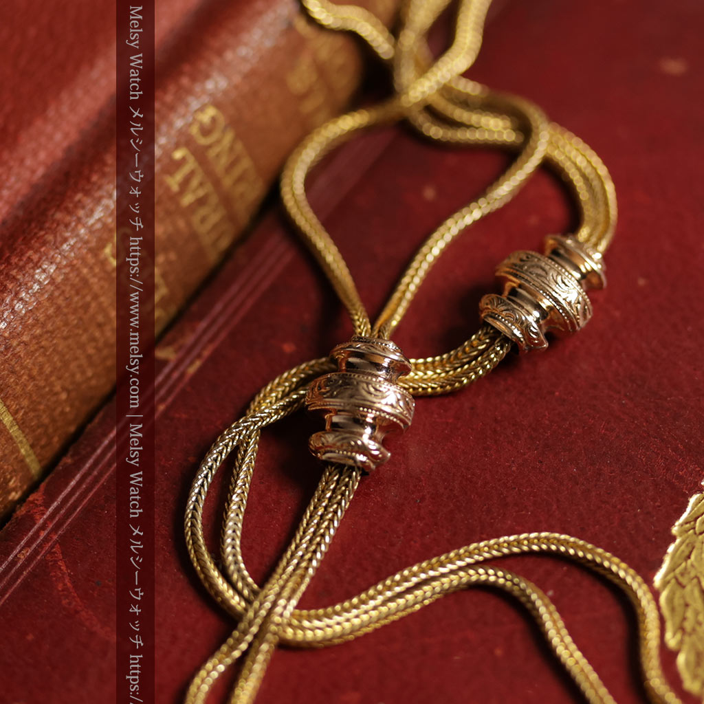 作り自体がアンティークですので、新しい年代のもので見かけることは非常に少ないのですが、定番の厚みや重厚さのあるチェーンとは違って、金属の紐状になっていますので、紐のように軽い感じで形状も紐のように柔らかく変えてくれる。