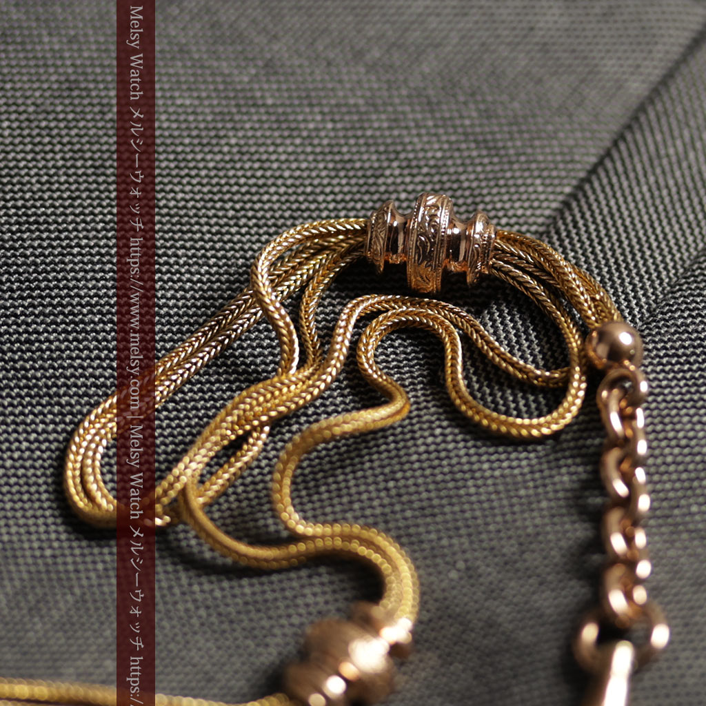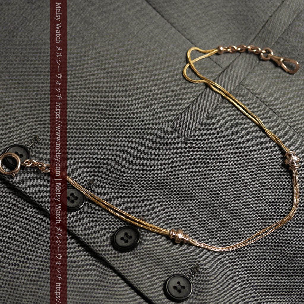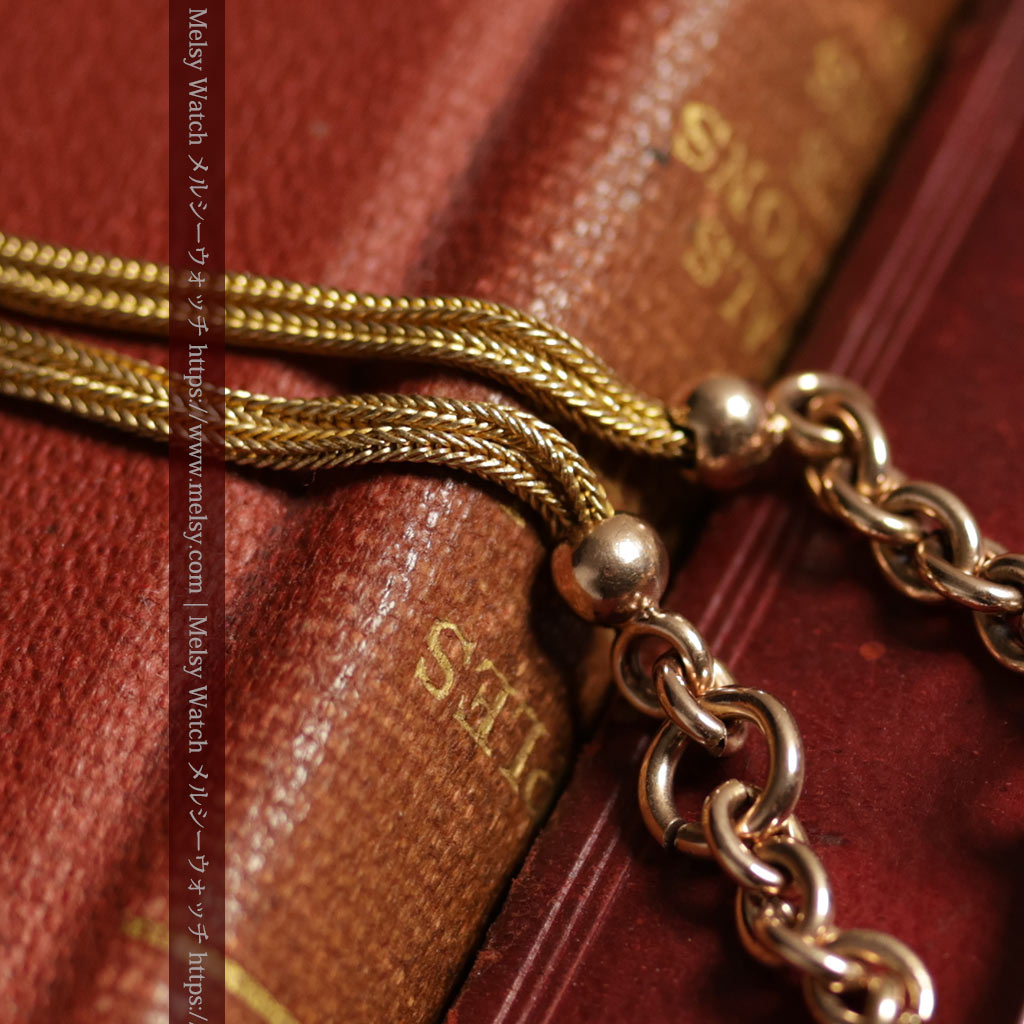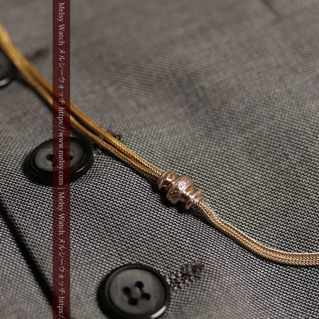 懐中時計のチェーンといえば、定番は輪やバーを繋いだものですが、このような紐状のものも、数は少なくなりますがあります。
