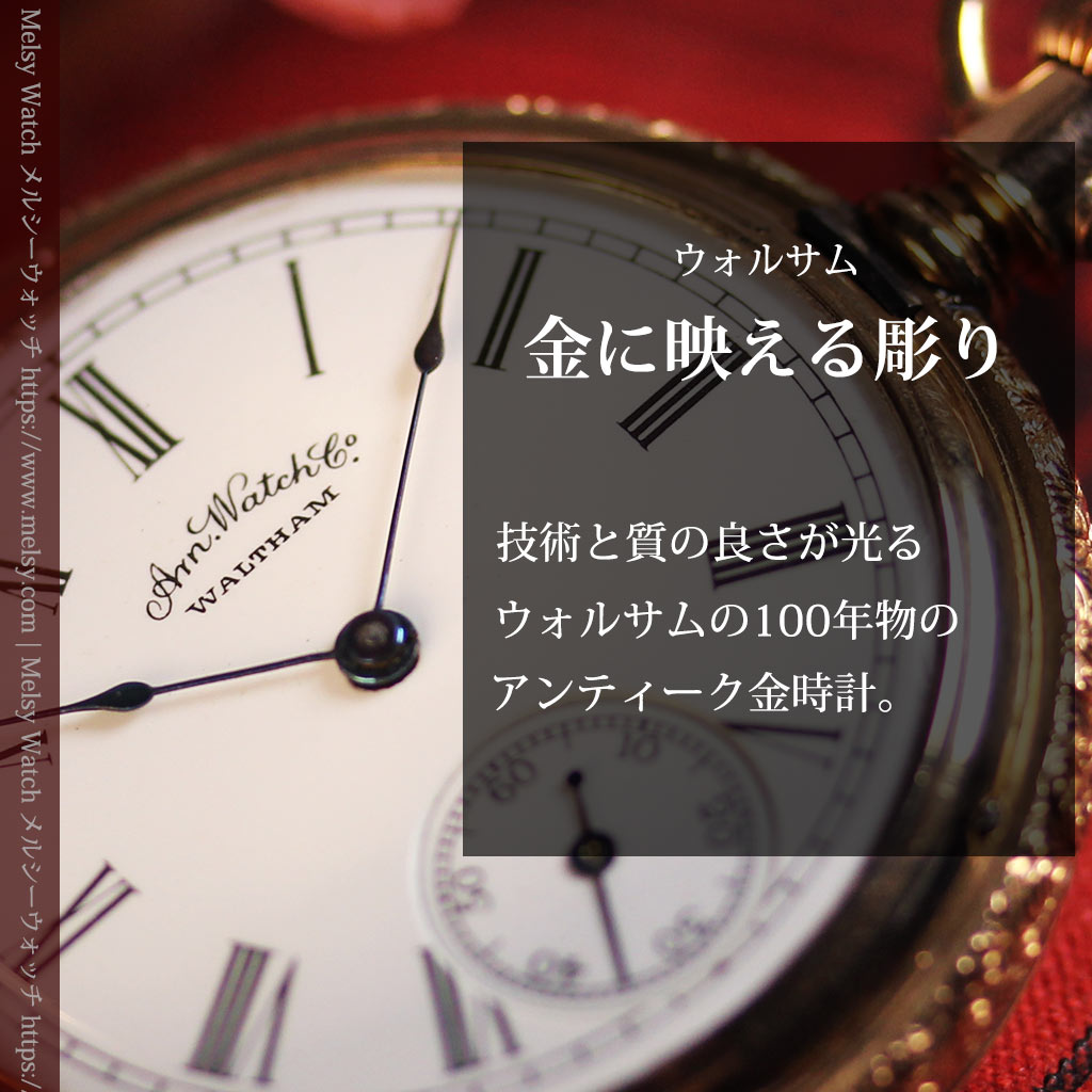 年代の古さがとても良い方に出ているもので、これは写真ではうまく伝えることができませんが、ケースの素材としてもしっかりと厚みがある、WALTHAM自身の自社ケースということもあって、刻印の写真から少しお分かり頂けるかもしれませんが、後年のケースよりも、しっかりと金が使われていることがわかります。