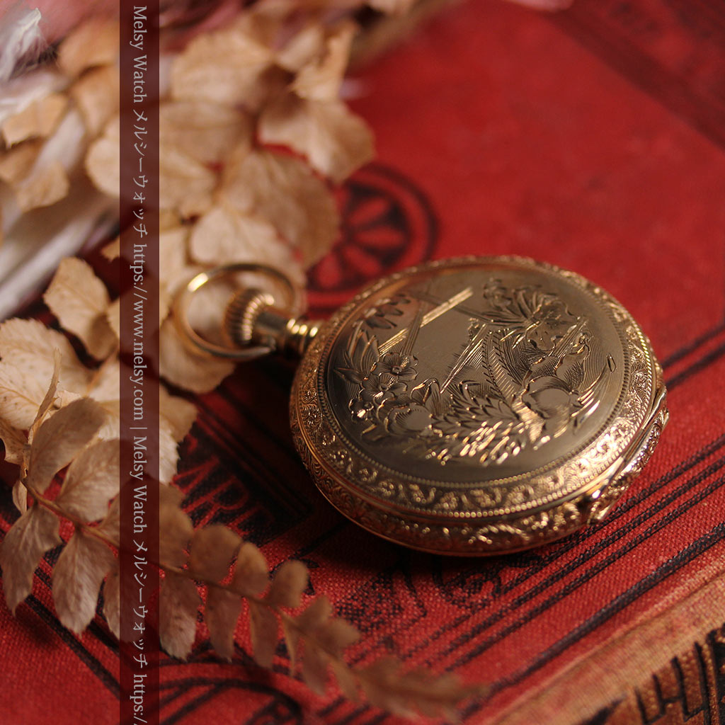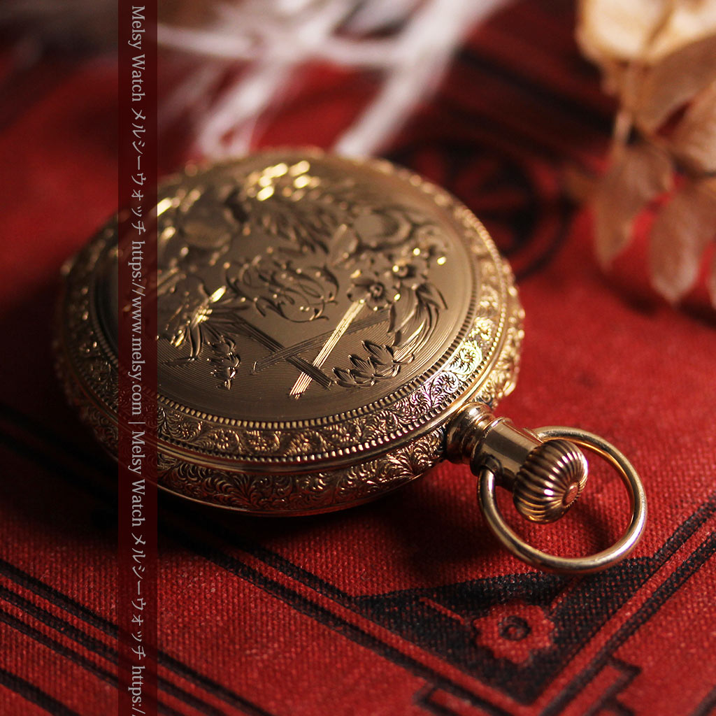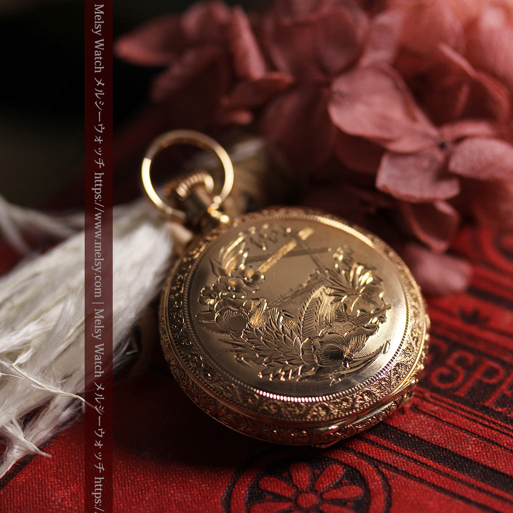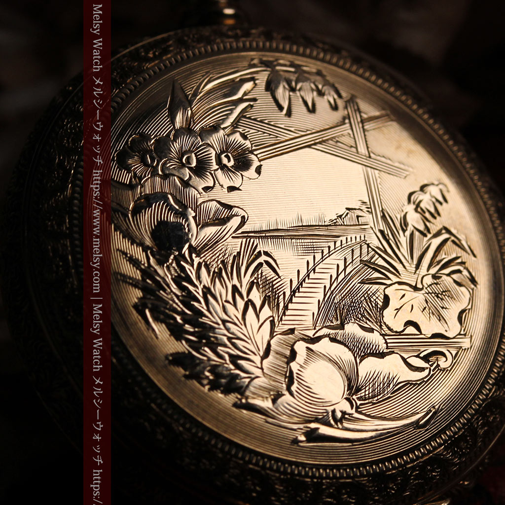 ケースの彫り・装飾が表裏・側面とほぼ全面にしっかりと入ったもので、懐中時計としてはとても魅力のある作りです。