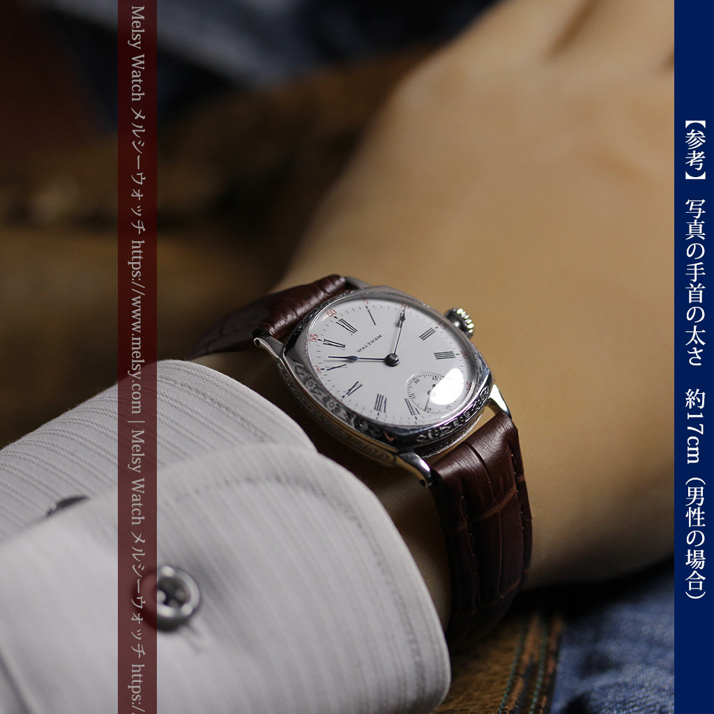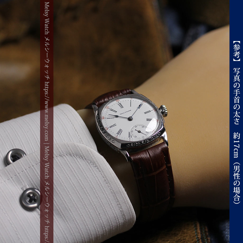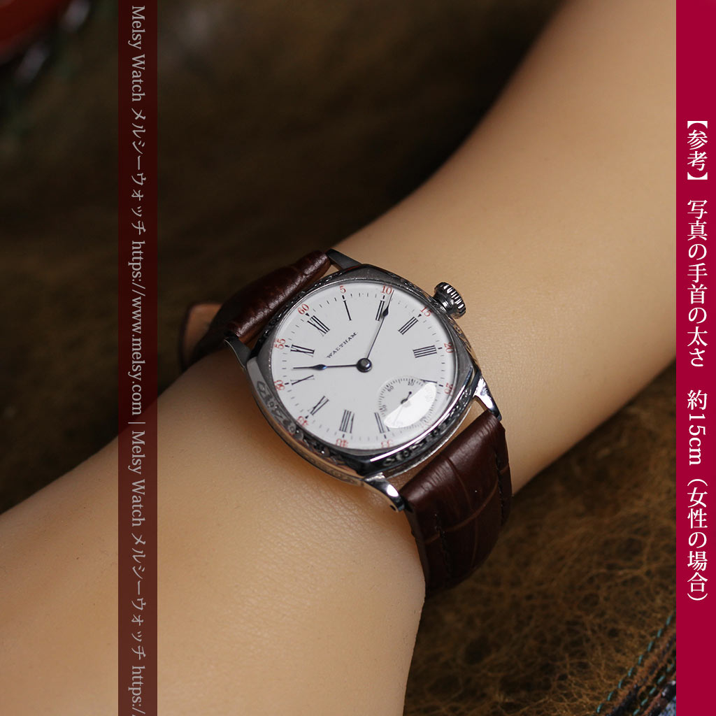 サイズ的には当時の男性用ですが、現在は女性の方も大きめの時計を付けられますので、普段大きめの時計を着けられている方は、これでも小さいくらいかもしれません。