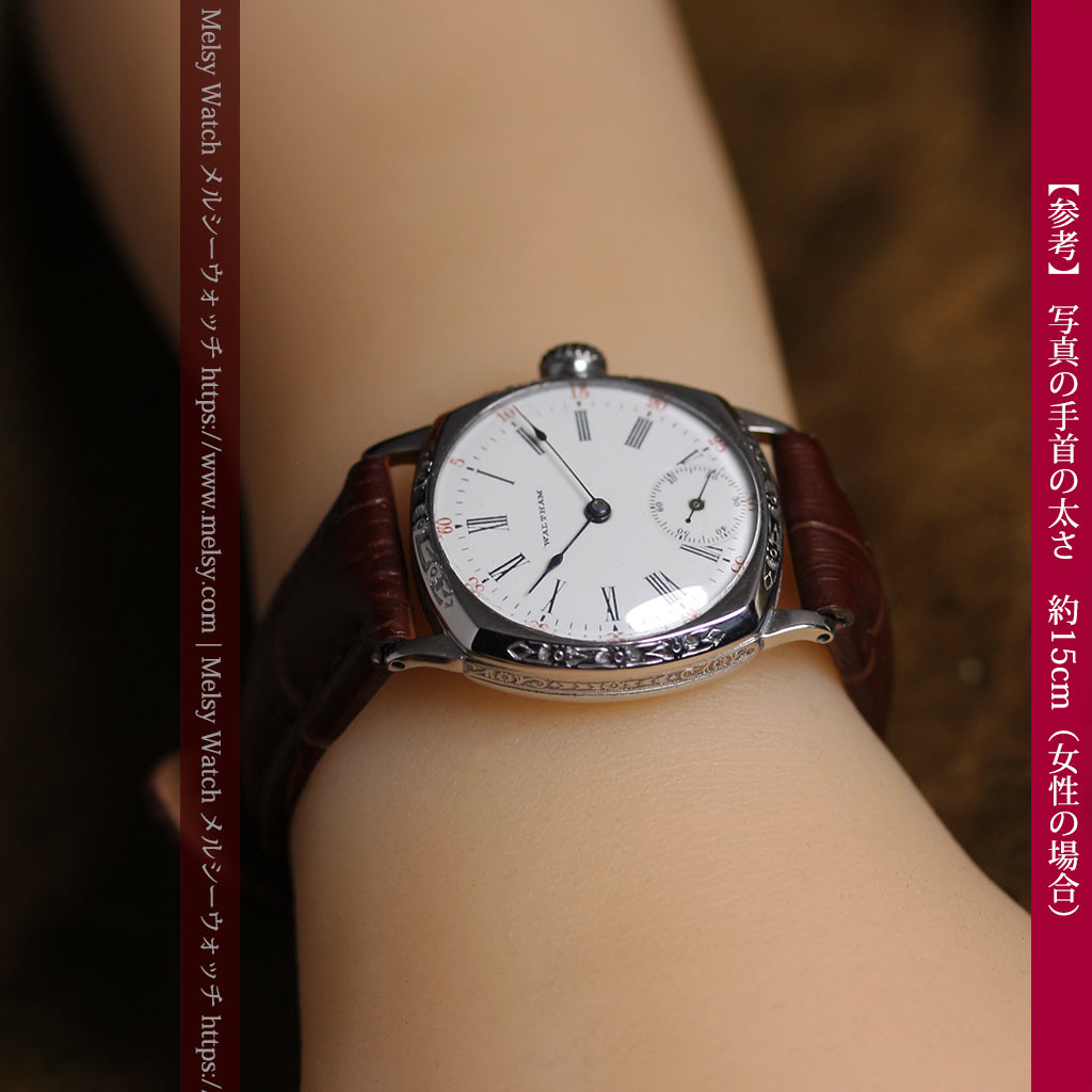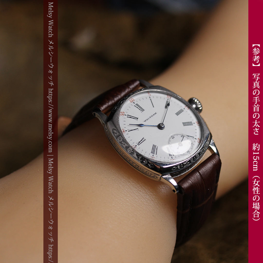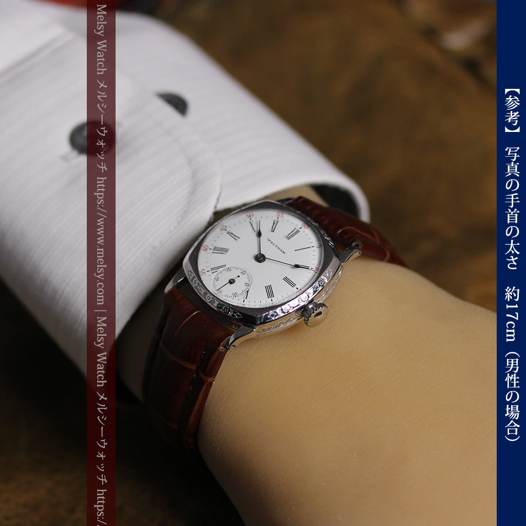 サイズ的には当時の男性用ですが、現在は女性の方も大きめの時計を付けられますので、普段大きめの時計を着けられている方は、これでも小さいくらいかもしれません。