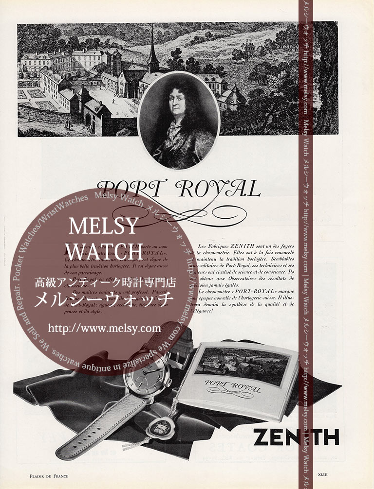 ゼニスの代表モデルであるポートロワイヤルの腕時計と貴族の肖像が描かれています。